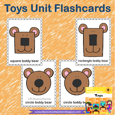A set of Toys Unit Flashcards for students to identify and name that include ball,teddy bear, car, doll, toybox,kite,robot. Aural and visual learners will benefit from the use of flashcards in class.